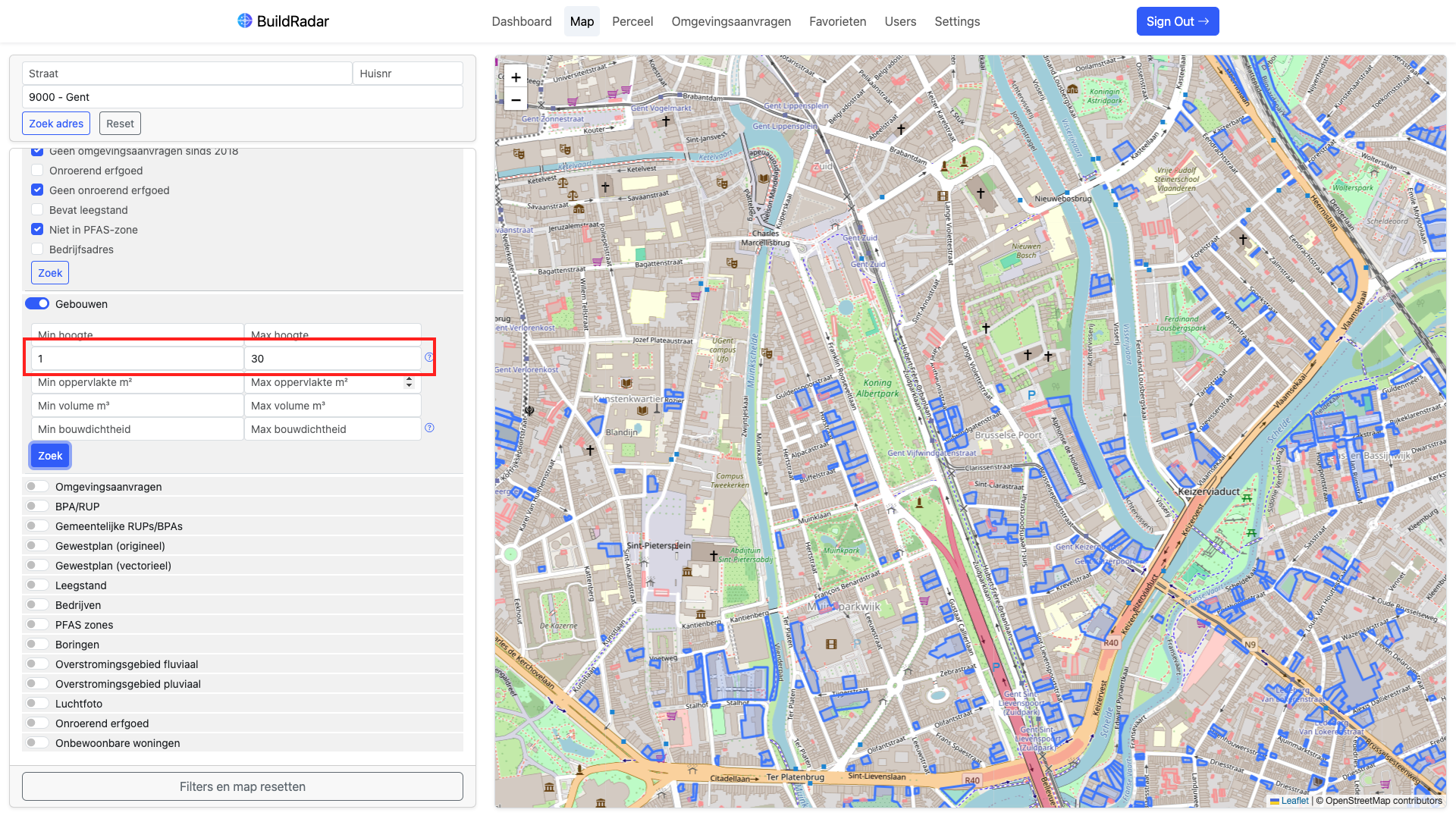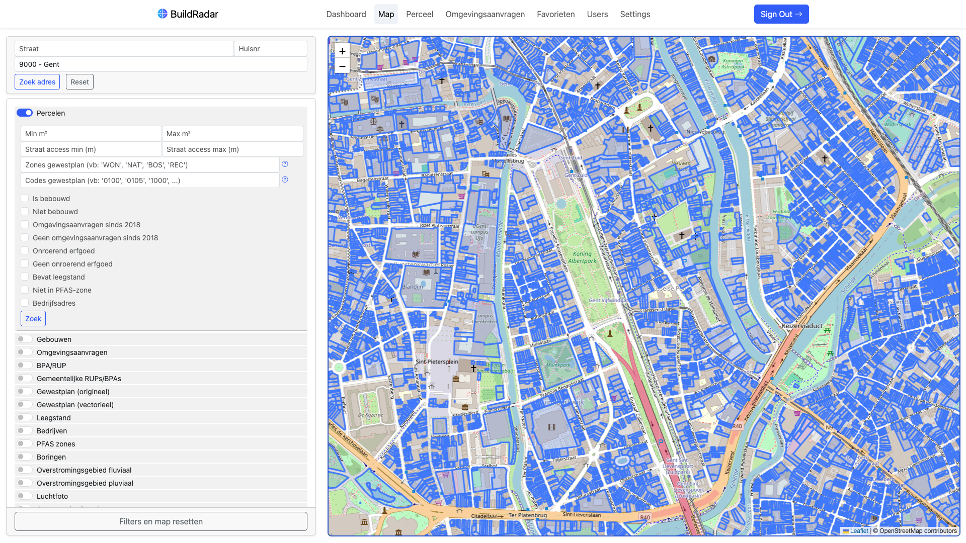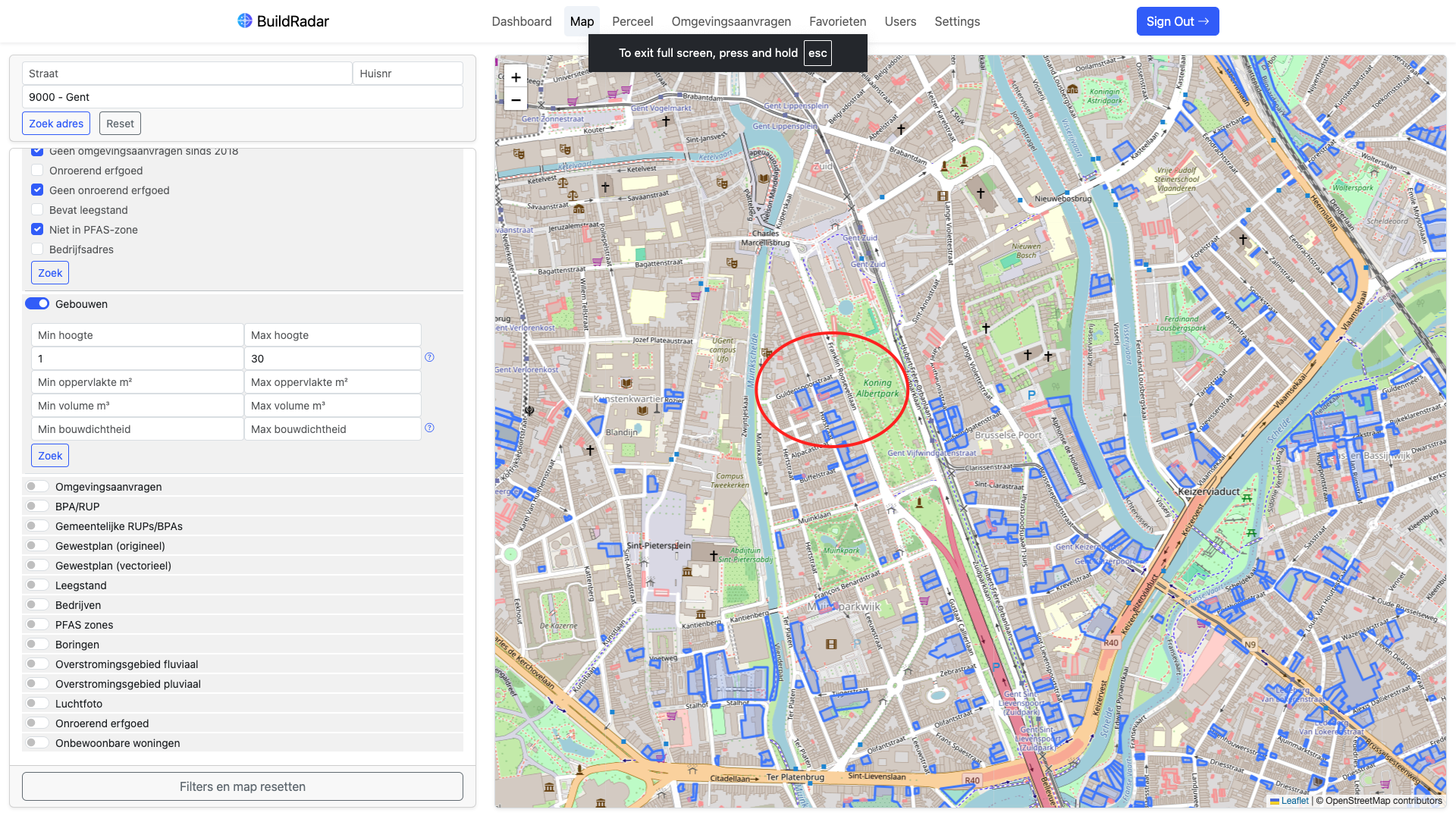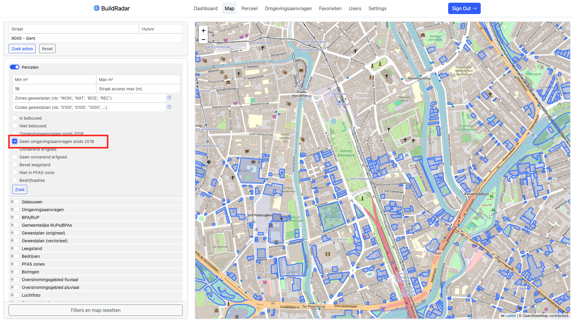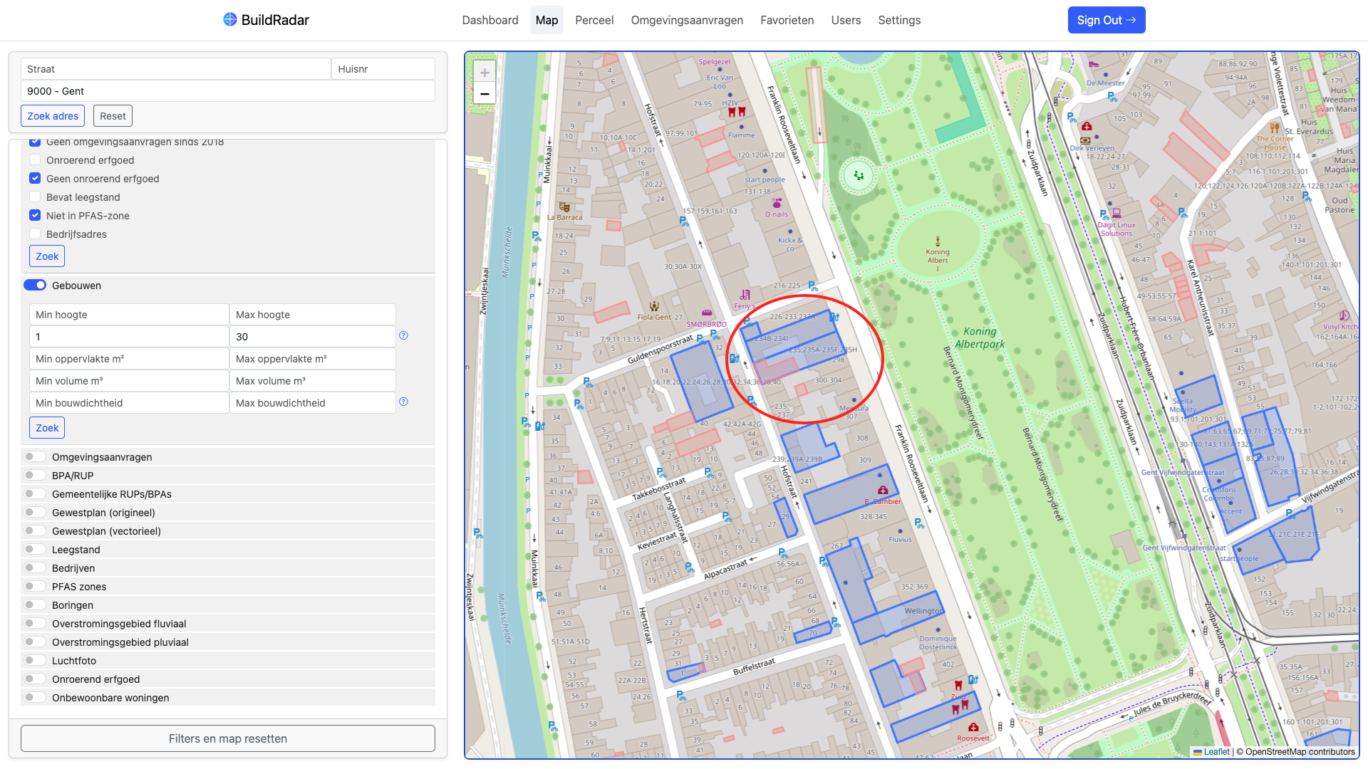 In dit voorbeeld gaan we op zoek naar een mogelijks interessant project in centrum Gent voor een projectontwikkelaar.