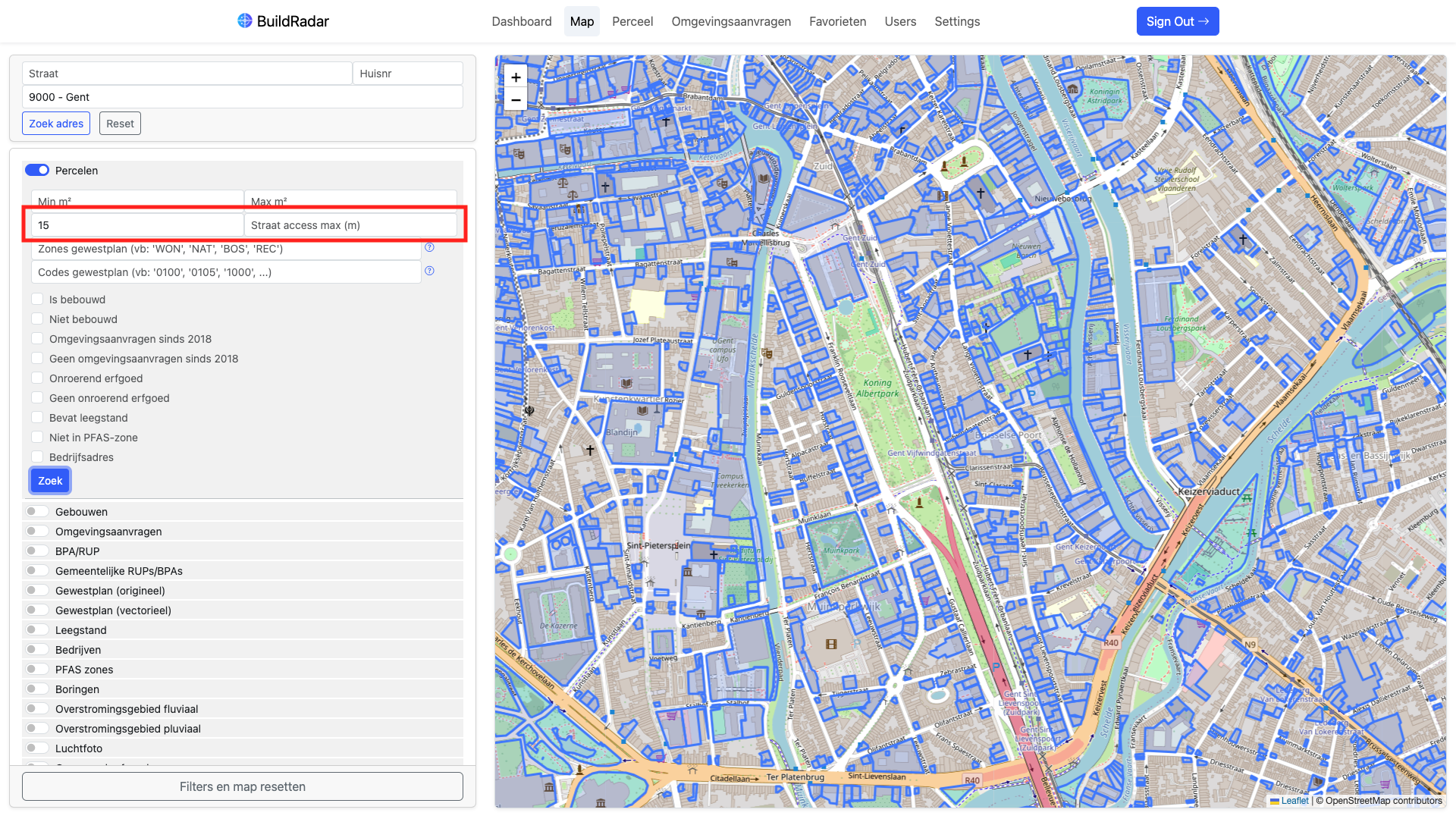 Uiteraard zijn er veel te veel mogelijkheden, dus we filteren alvast alle percelen weg die geen 15 meter toegang hebben tot de straatkant.