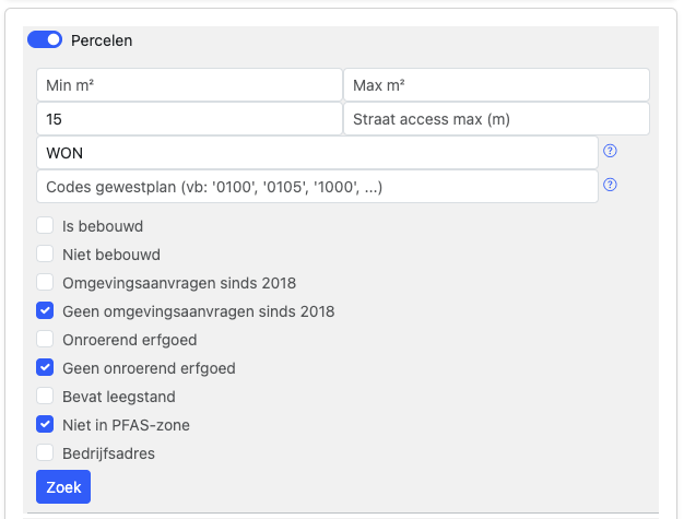 Door de filter te activeren, vallen er al een heleboel percelen weg.