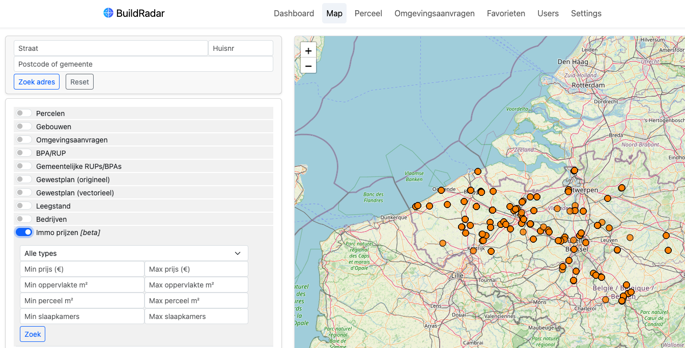 Met BuildRadar bouwen we een databank op van immo gegevens. Dit wordt als een nieuwe laag gevisualiseerd: