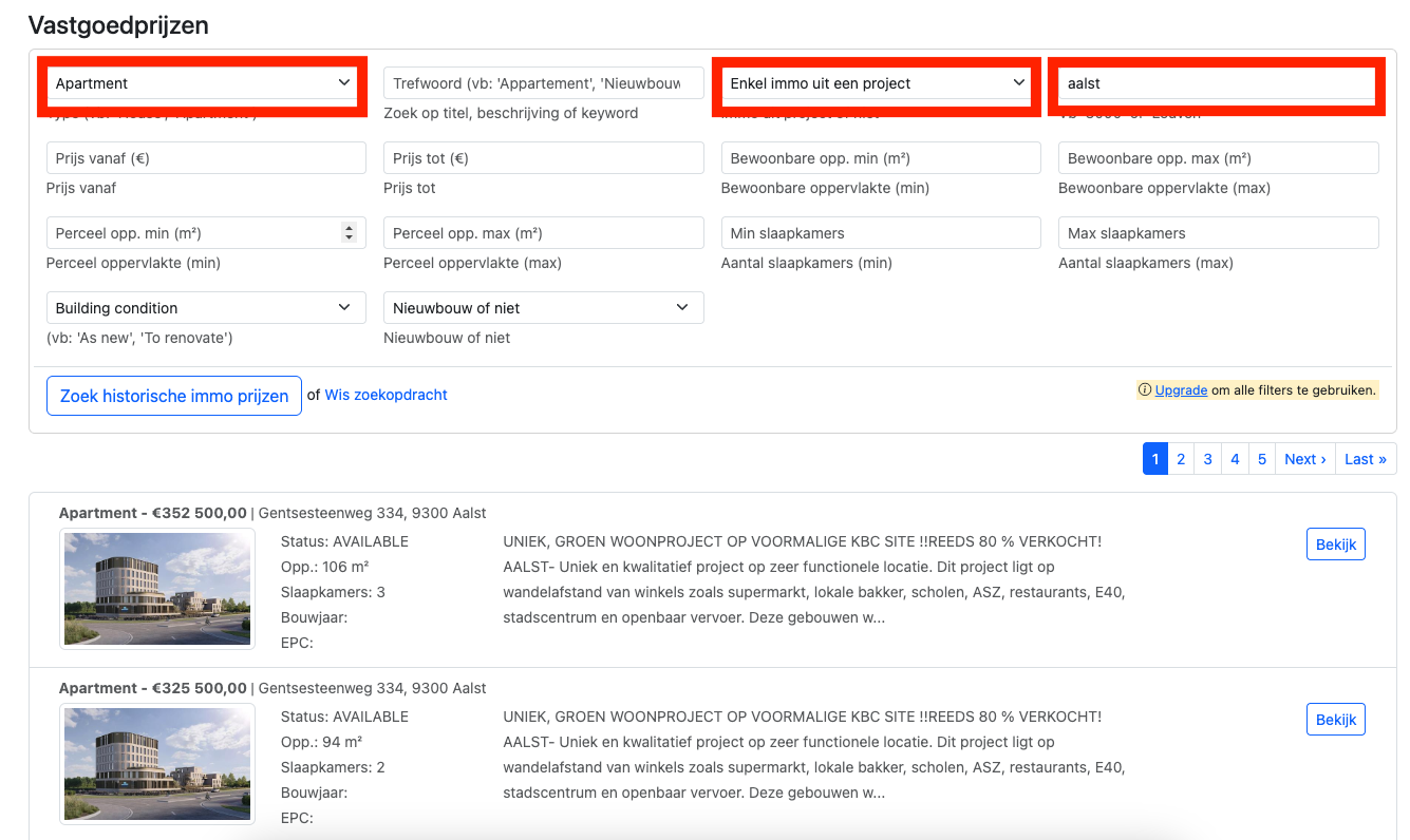 Immo advertenties in lijstvorm, met bijhorende filters:
