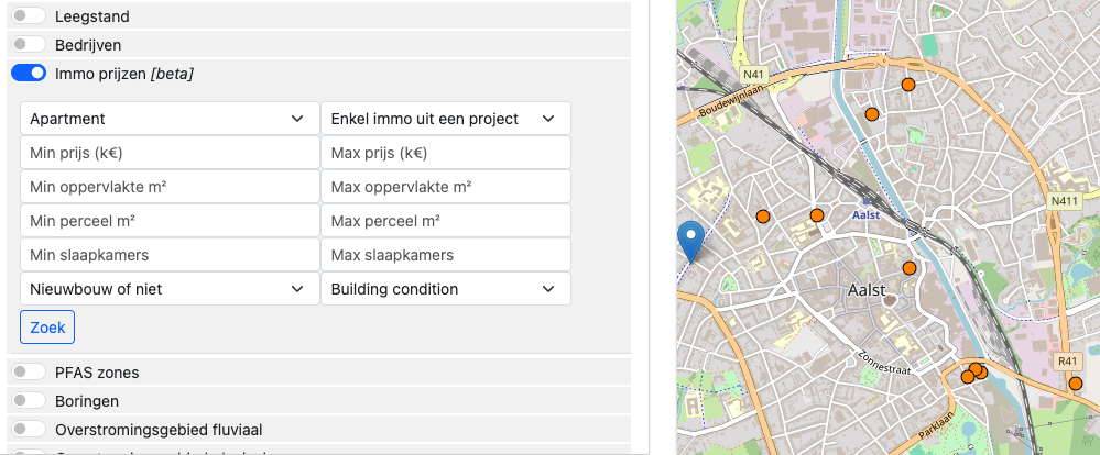 Immo advertenties op de kaart met filters: