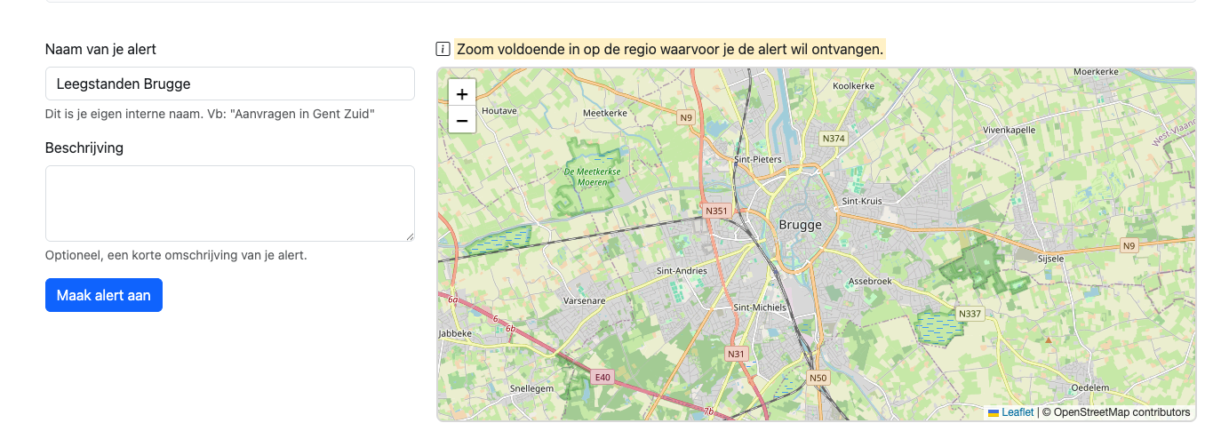 Vervolgens zoom je in op de regio waarvoor je alerts wilt ontvangen en maak je de alerts aan. Wanneer een nieuwe leegstand toegevoegd wordt in die regio zal je een email notificatie ontvangen.
