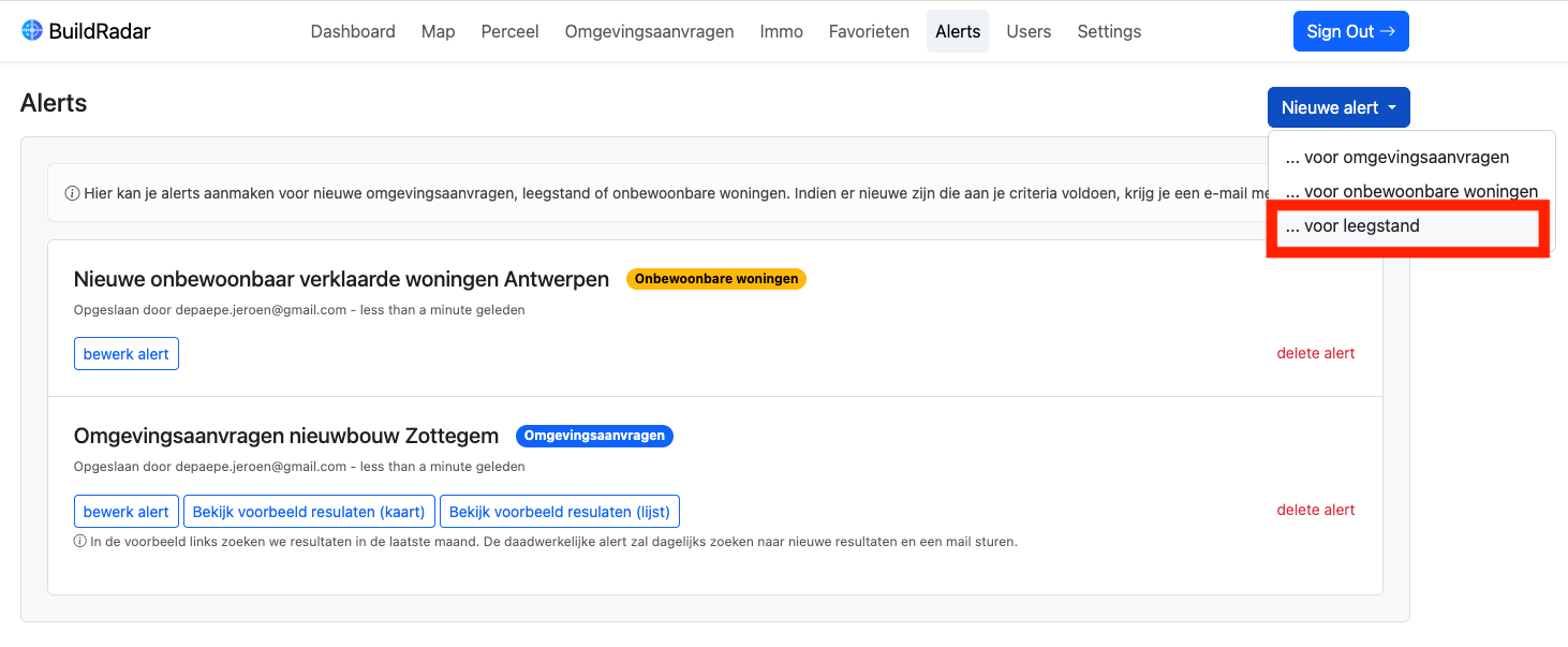 Ga hiervoor naar 'Alerts' in jouw online BuildRadar account: https://buildradar.be/alerts