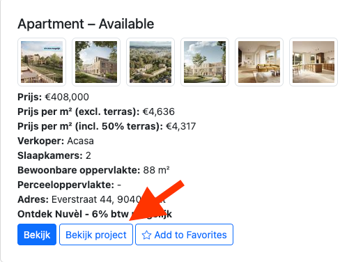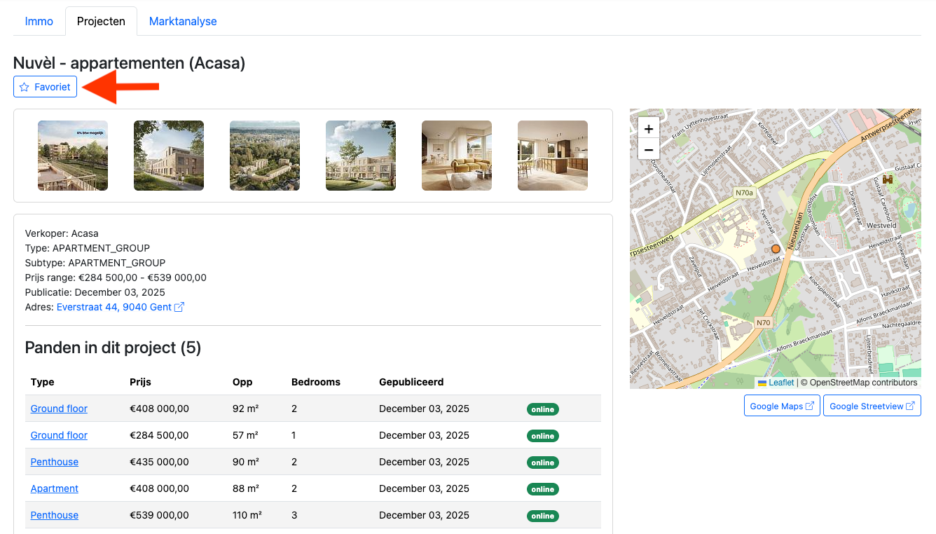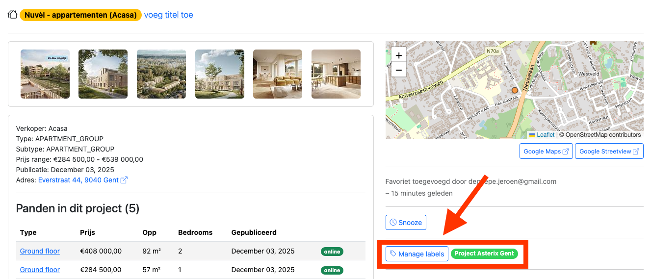 Via favorieten kan je de in de vorige stap geselecteerde prijspunten terugvinden (type = Immo of Project) en er eenzelfde label aan hangen, bv ‘Project Asterix Gent’: