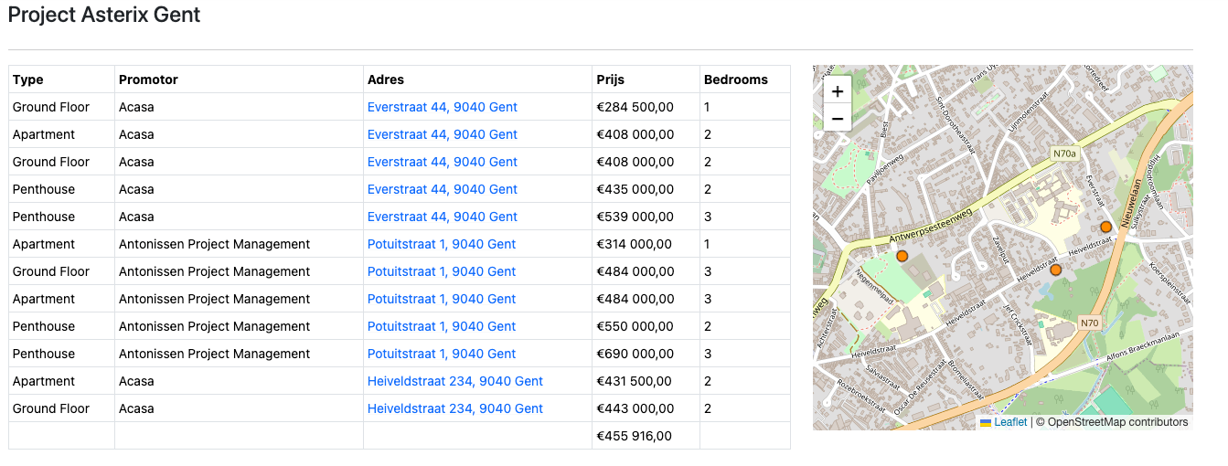 We vinden een overzicht van alle geselecteerde prijspunten, in lijst en op de kaart, met bijhorende gegevens zoals prijs, aantal slaapkamers, en meer: