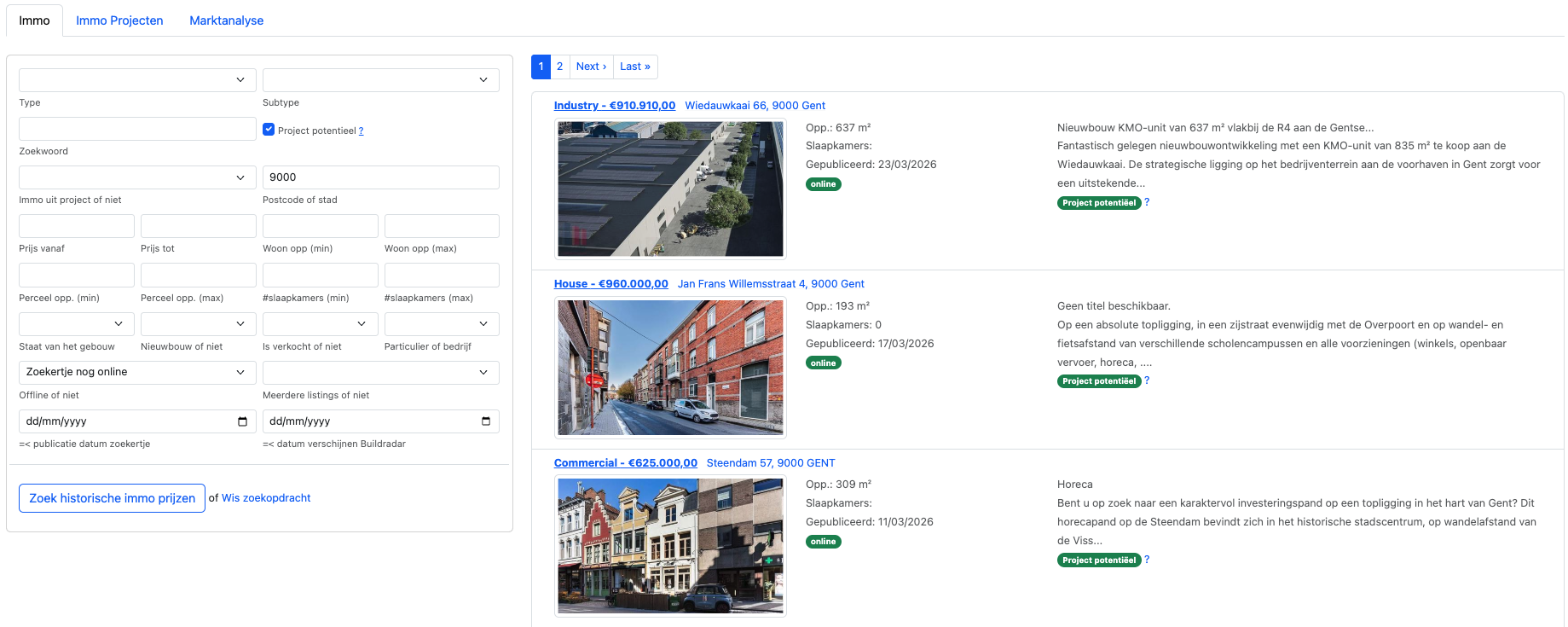 We scannen met behulp van AI welke immo-zoekertjes mogelijks interessant kunnen zijn voor ontwikkelaars. Hier een voorbeeld met mogelijks interessante zoekertjes in Gent: